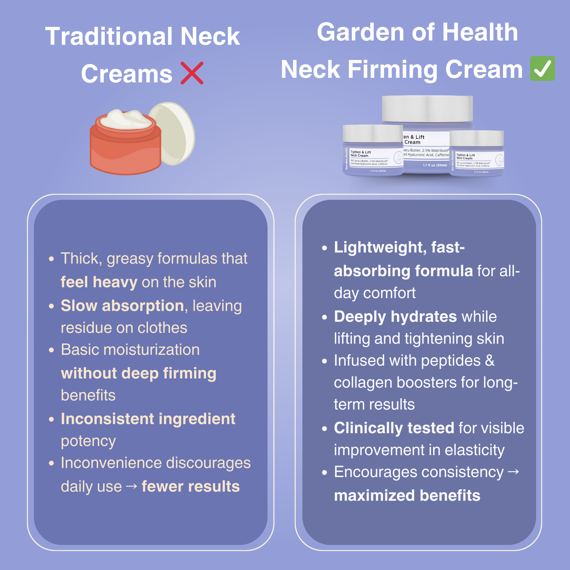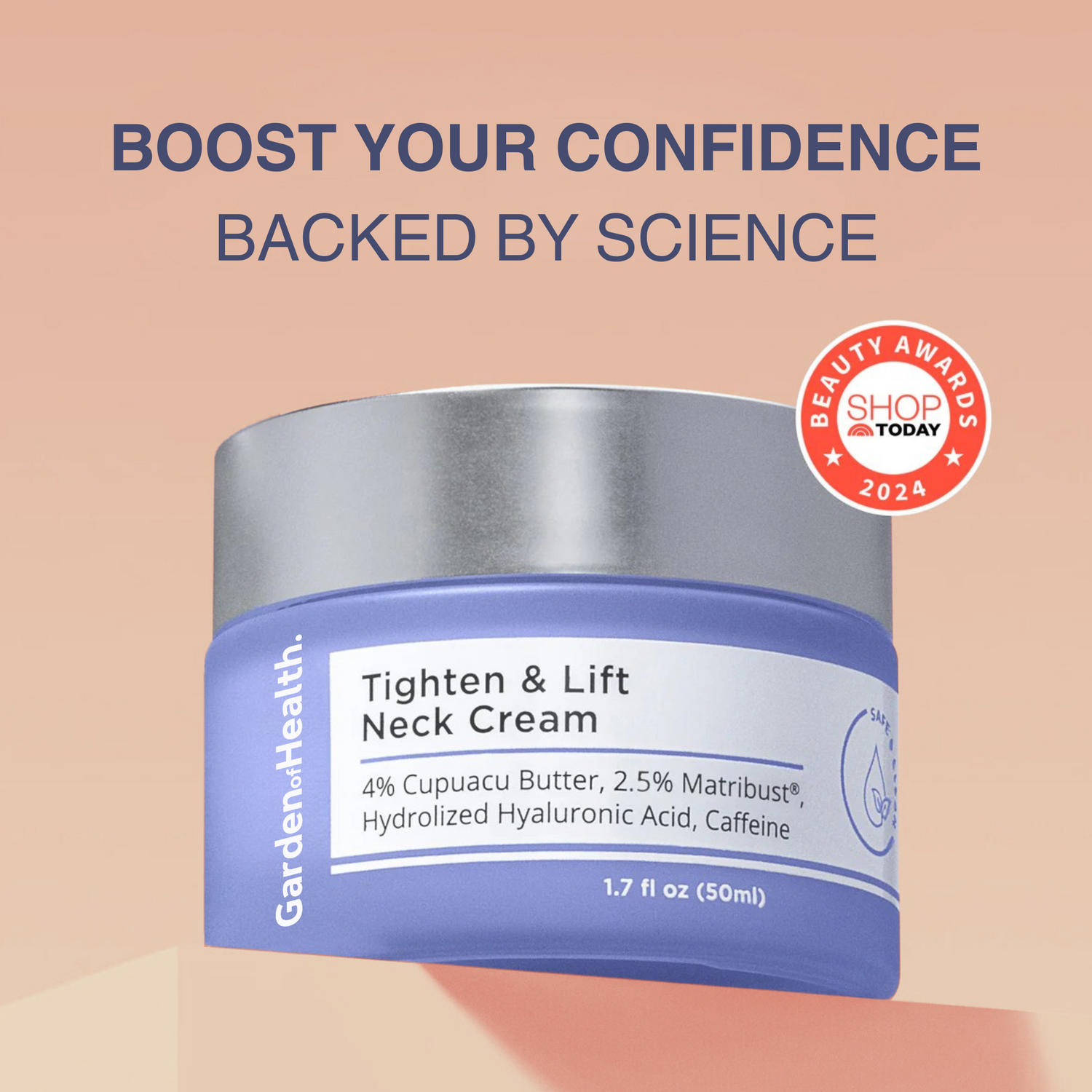 Garden of Health® Tighten & Lift Neck Cream is formulated to target the delicate skin of your neck and chest, delivering a blend of high-quality ingredients that work to tighten, smooth, and rejuvenate. Apply daily to restore your skin’s youthful appearance with ease.